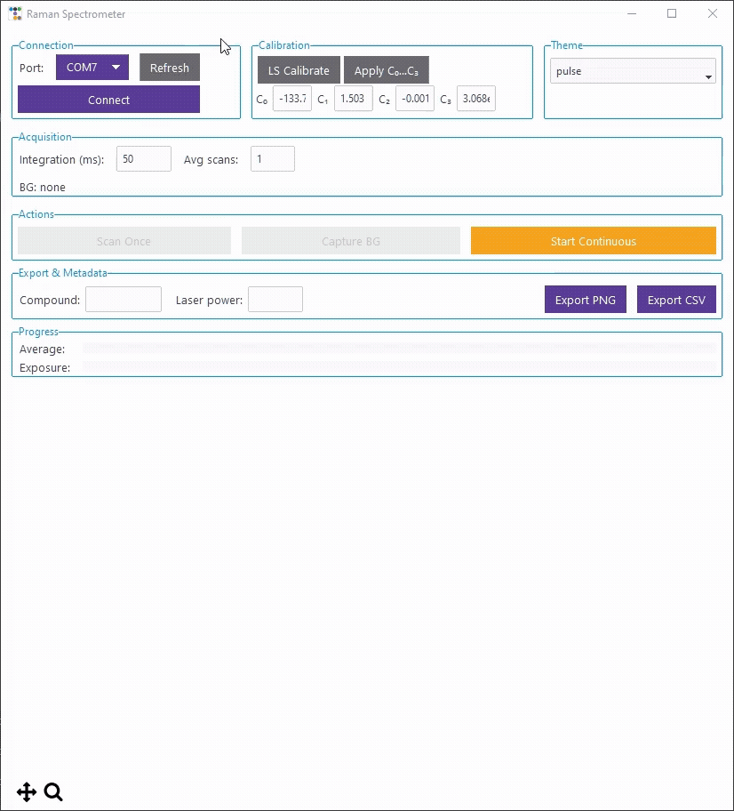 Alpha versions of the acquisition and post-processing software are available now and allow serial communication with the B&W Tek spectrometer.